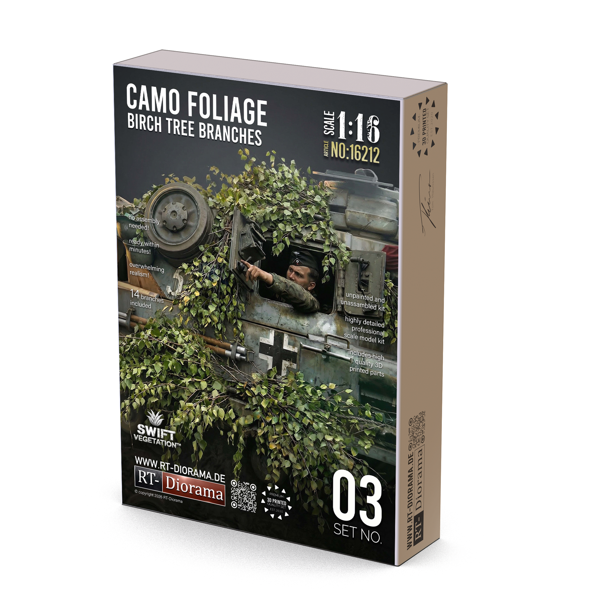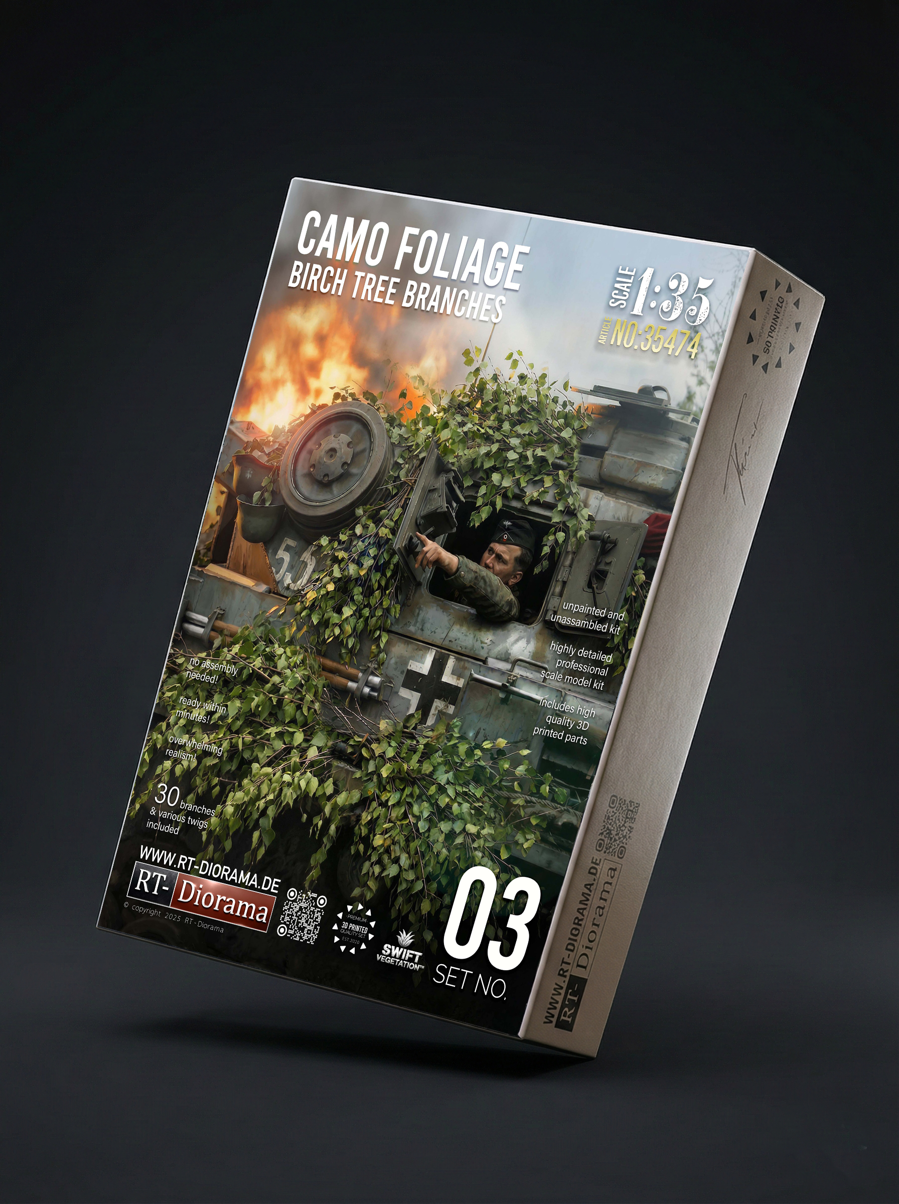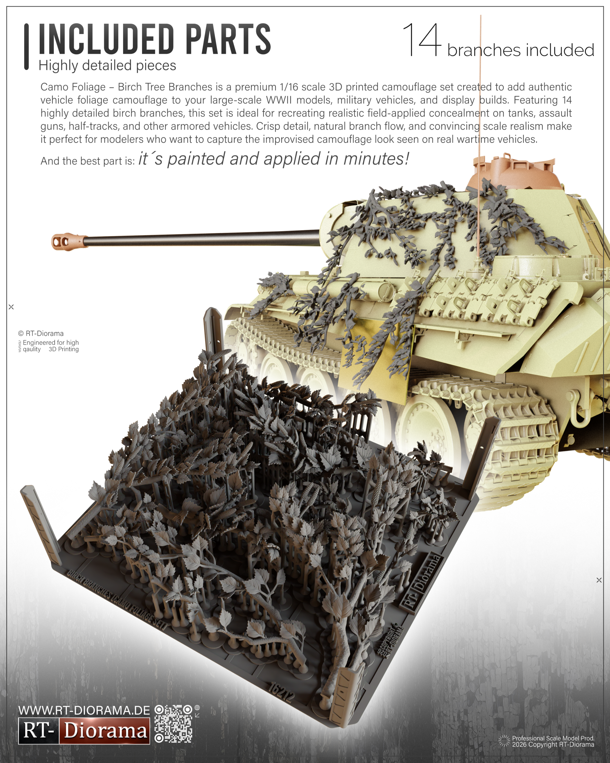 The set includes 14 highly detailed birch branches and twigs, carefully designed with natural flow, convincing structure and crisp leaf detail to achieve an authentic scale appearance. These branches are ideal for recreating the improvised camouflage look frequently seen on real combat vehicles, especially in wooded and rural environments where crews used fresh local vegetation for concealment.