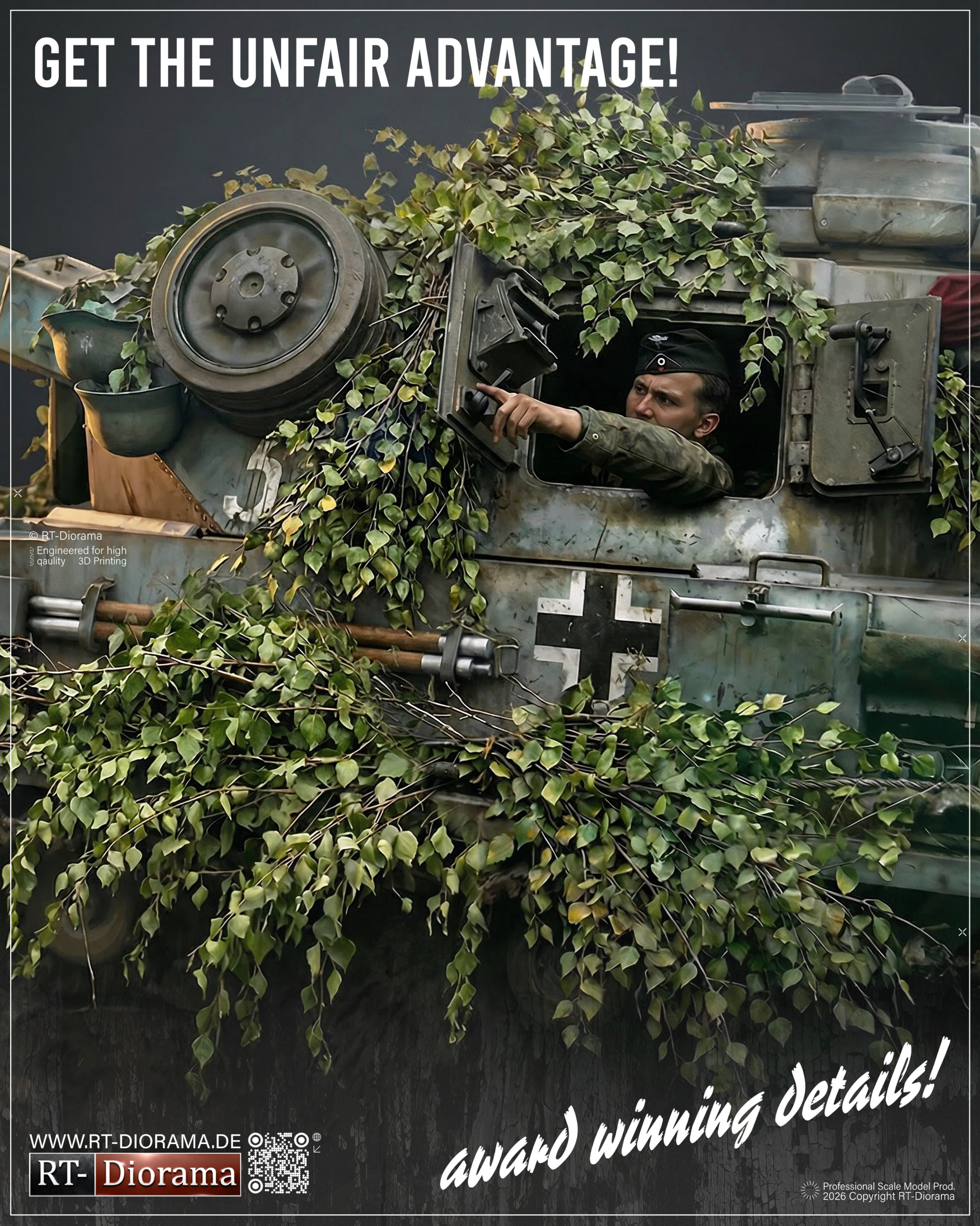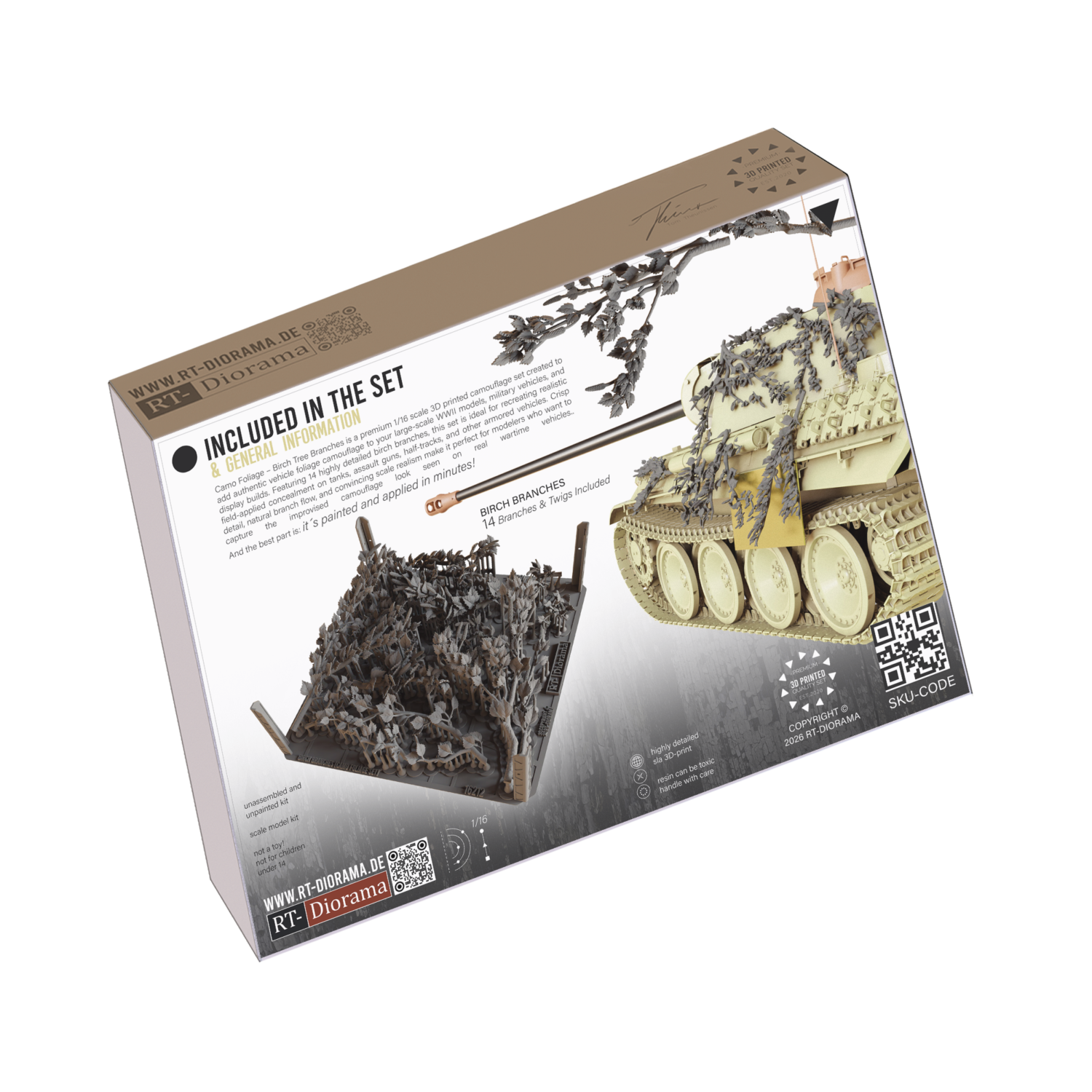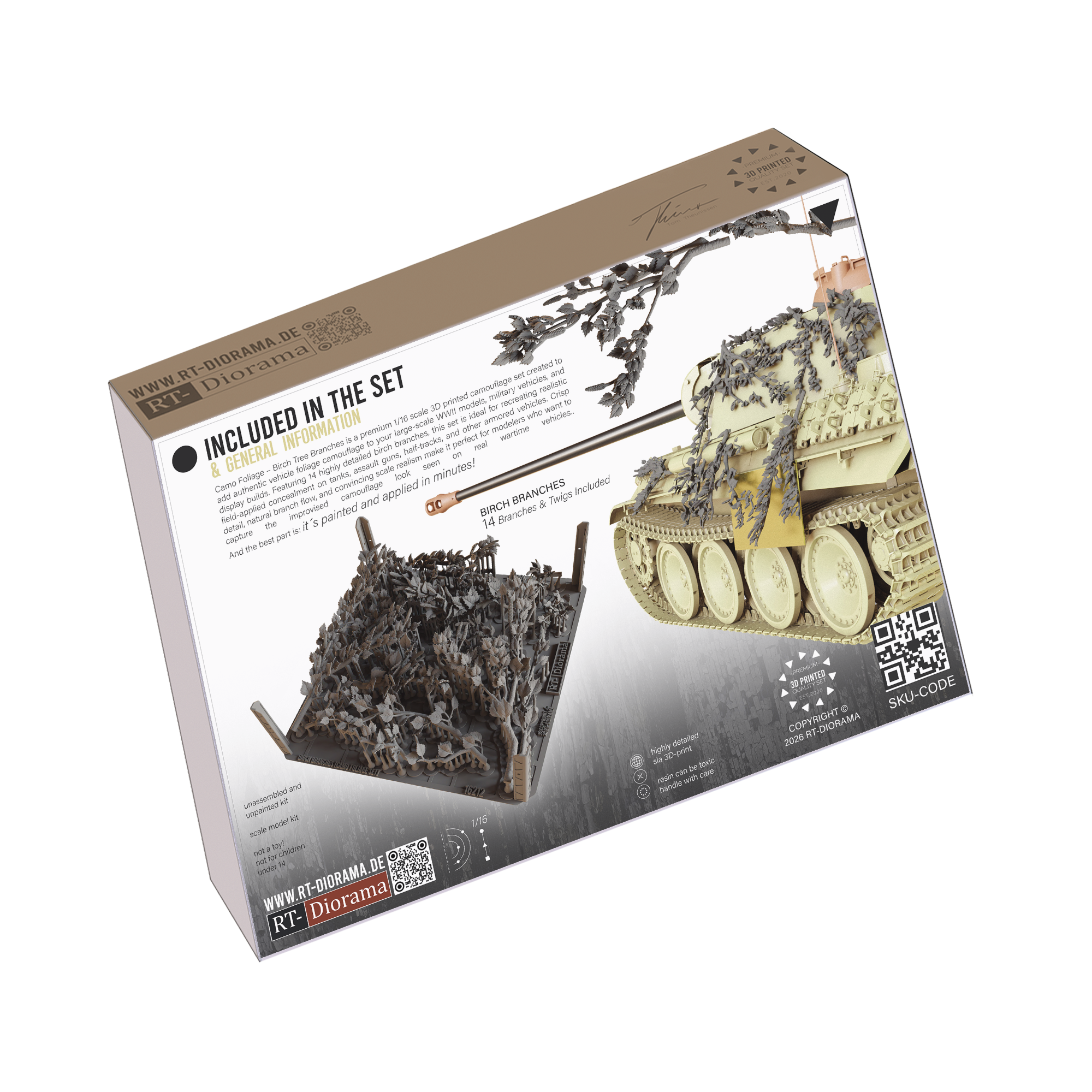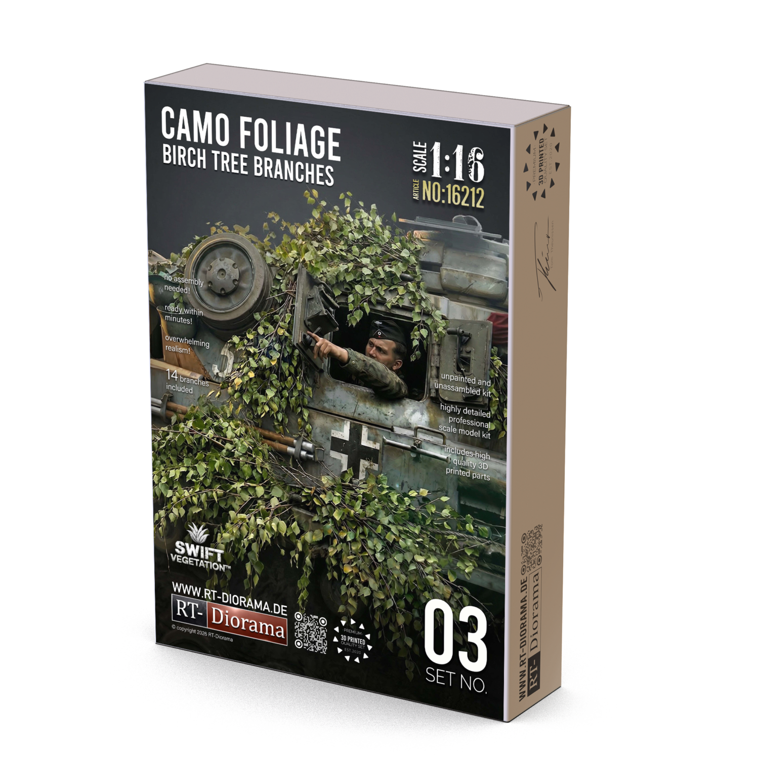 The set includes 14 highly detailed birch branches and twigs, carefully designed with natural flow, convincing structure and crisp leaf detail to achieve an authentic scale appearance. These branches are ideal for recreating the improvised camouflage look frequently seen on real combat vehicles, especially in wooded and rural environments where crews used fresh local vegetation for concealment.