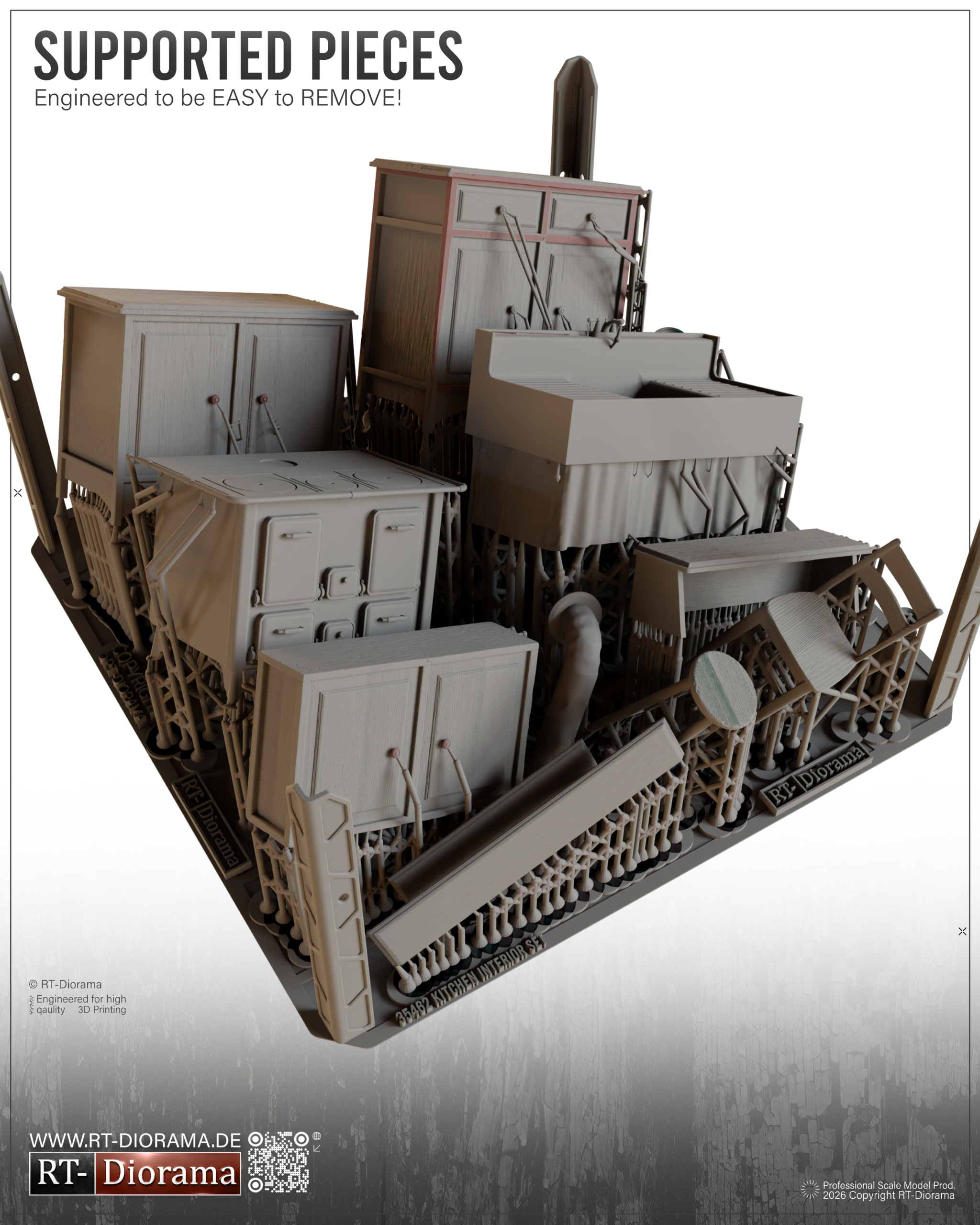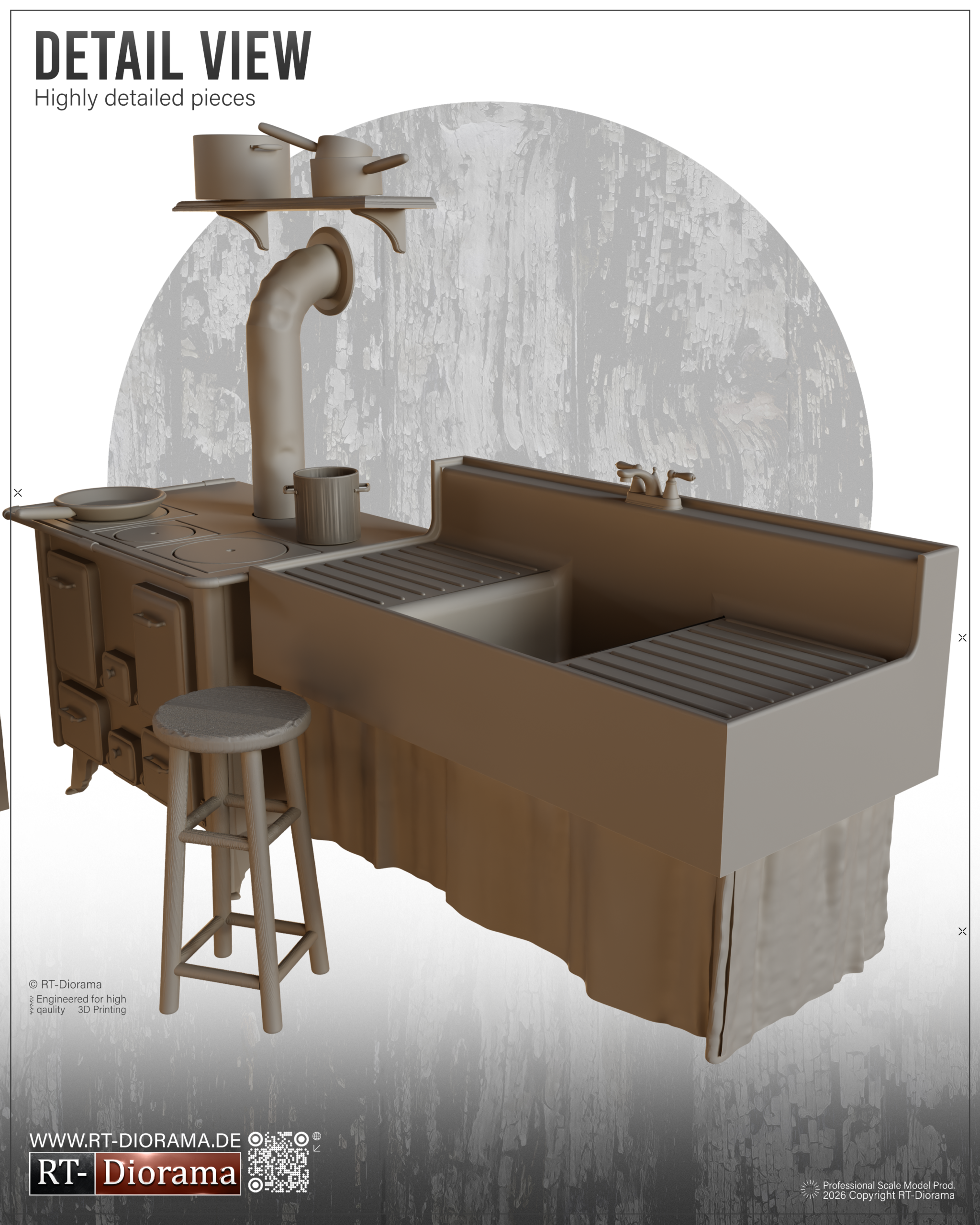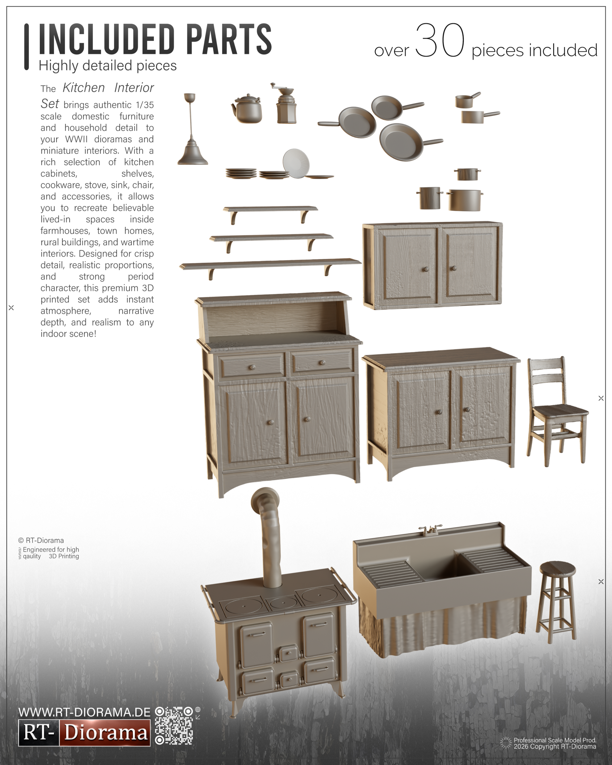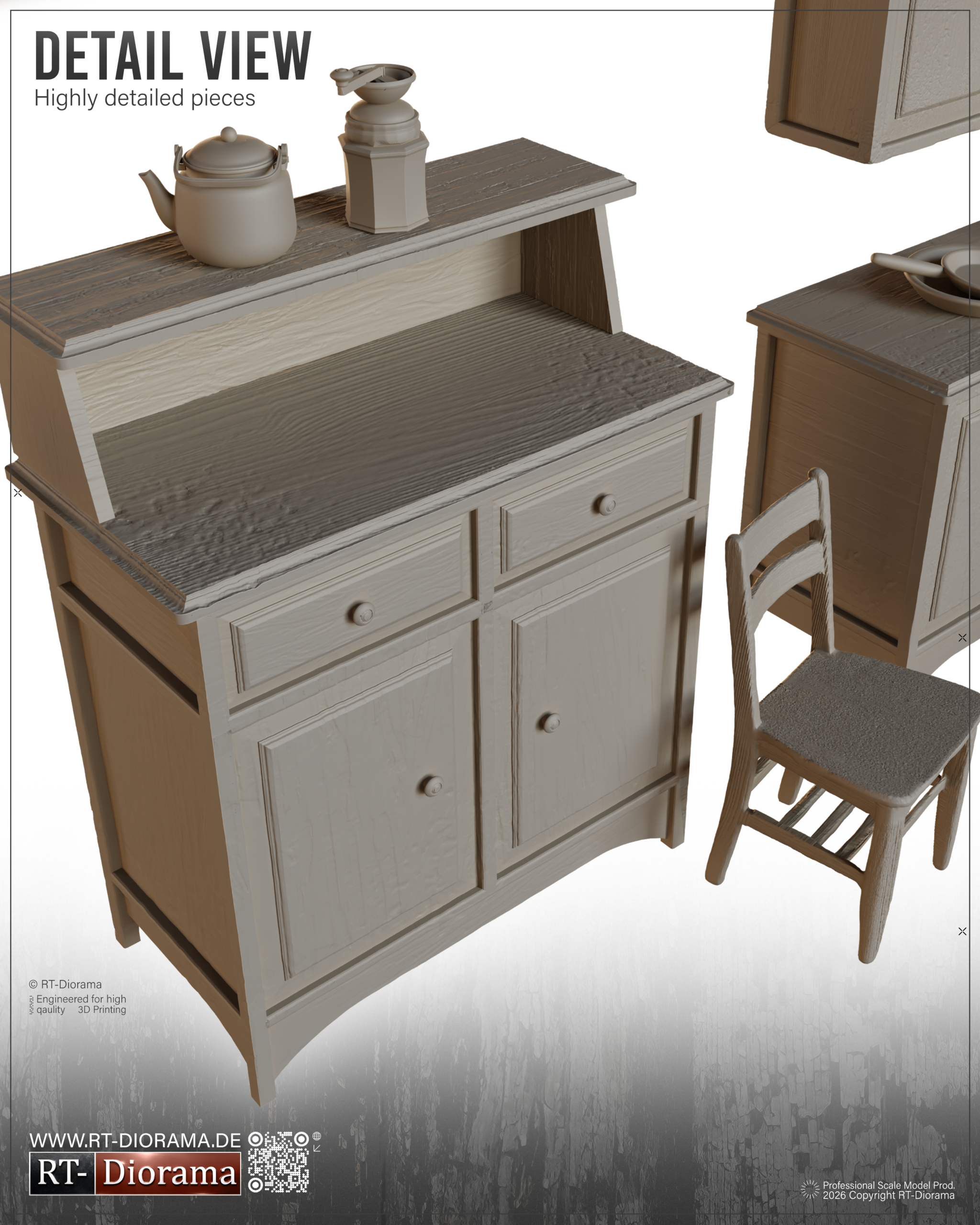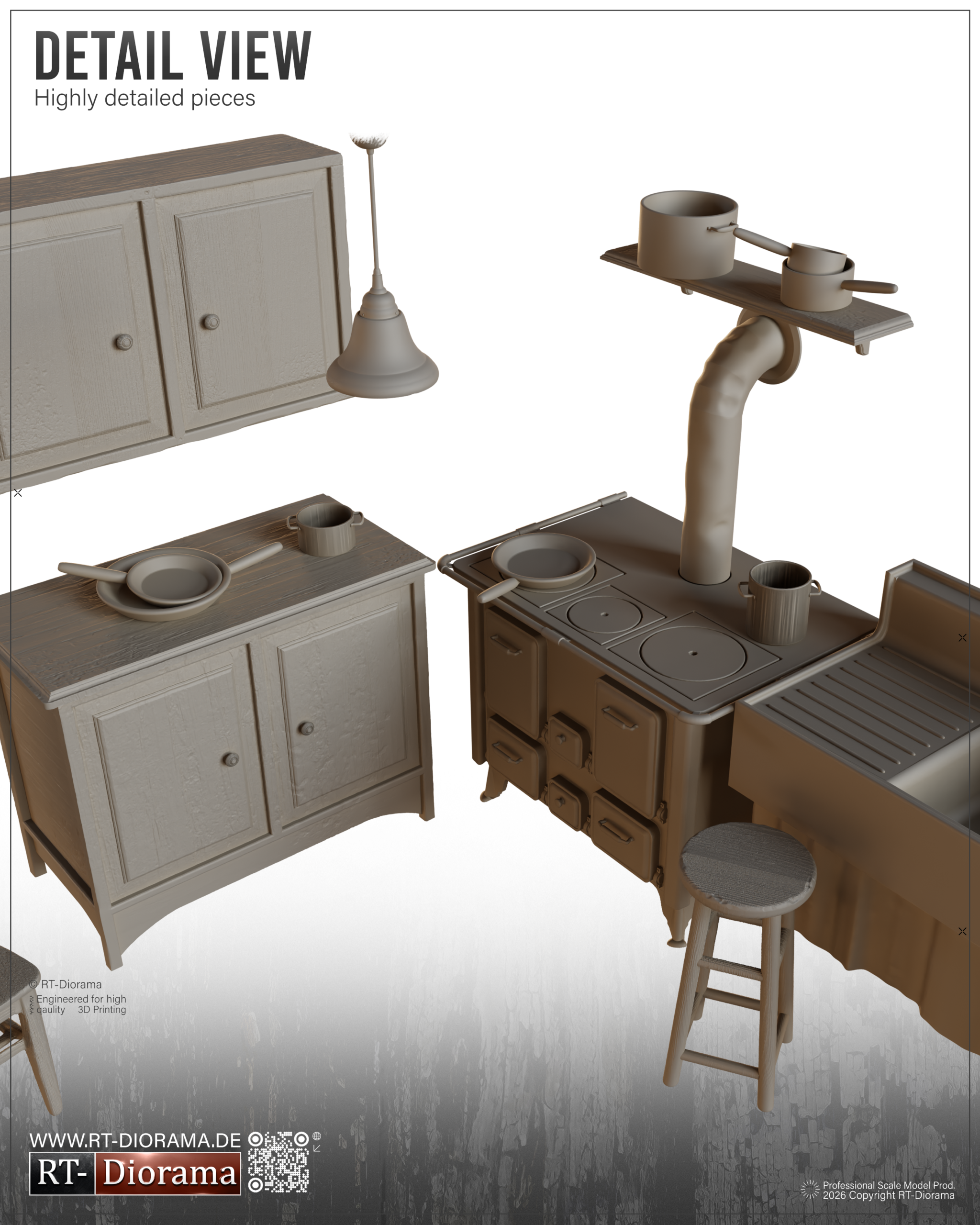 Designed to capture the look of a believable period kitchen, this premium SLA 3D printed set includes a broad and carefully selected assortment of furniture, fixtures and household items to help you create realistic interior scenes with true domestic character.