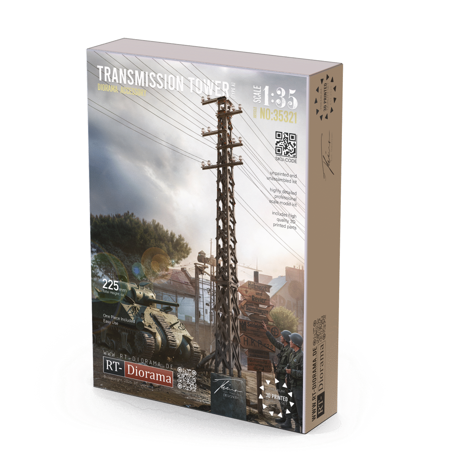 Elevate your scale scenes with the 1/35 Transmission Tower Type A kit, a highly detailed structure standing approx. 225 mm tall. Featuring 3D-printed parts and sharp lattice detailing, this tower is perfect for WWII, Cold War, or industrial dioramas. A versatile accessory that adds striking vertical height, atmosphere, and realism to any battlefield, city, or countryside layout.
