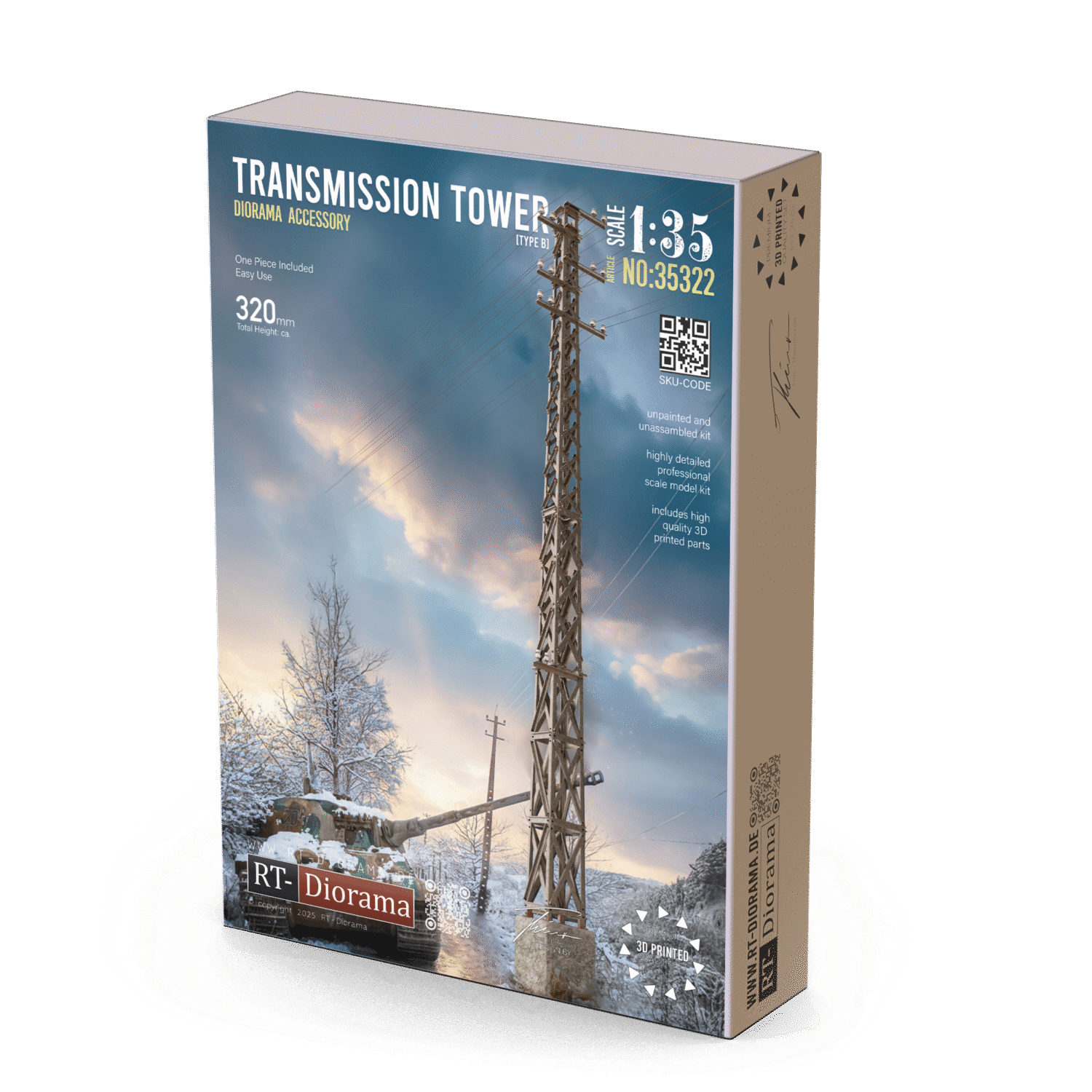Create commanding landscapes with the 1/35 Transmission Tower Type B kit, a tall structure reaching approx. 320 mm in height. Designed with high-quality 3D-printed components, this model captures the rugged design of utility towers often seen in wartime and post-war settings. Perfect for large-scale dioramas, snowy landscapes, or urban battlefields where vertical realism is key.